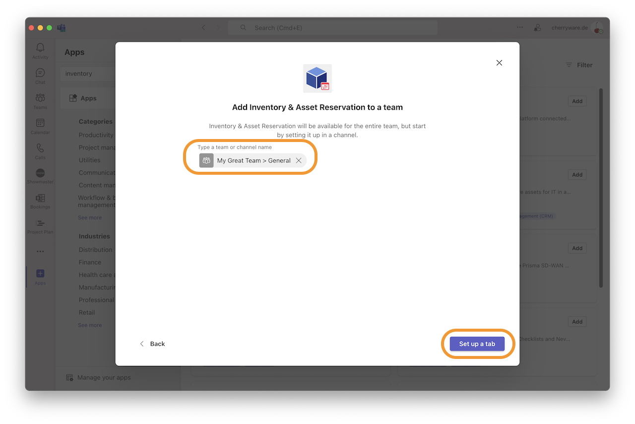 - Select a team and channel where you would like to add Diagrams for Microsoft Teams and press Set up a tab.
