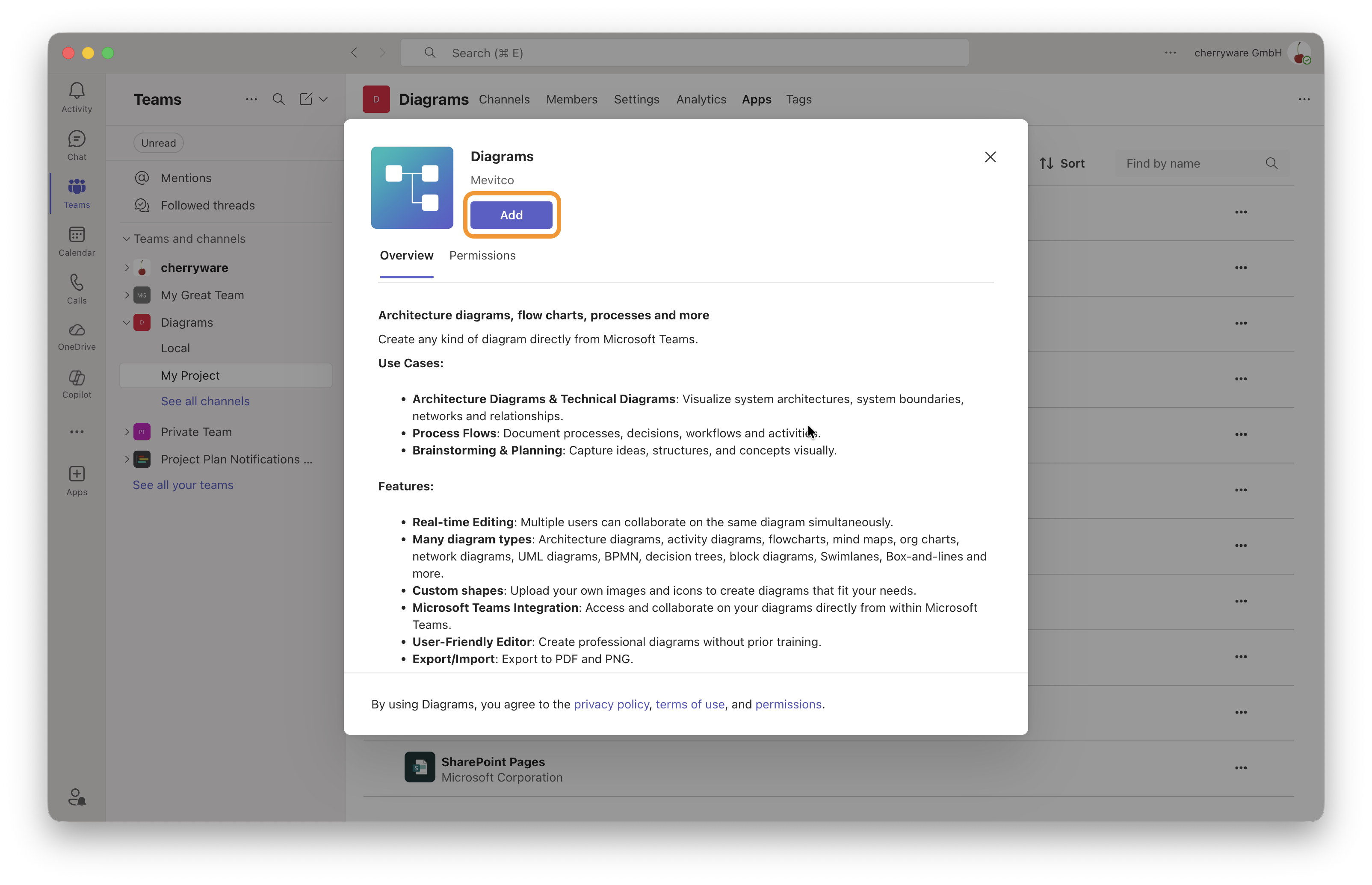- Select a team and channel where you would like to add Diagrams and press Go.